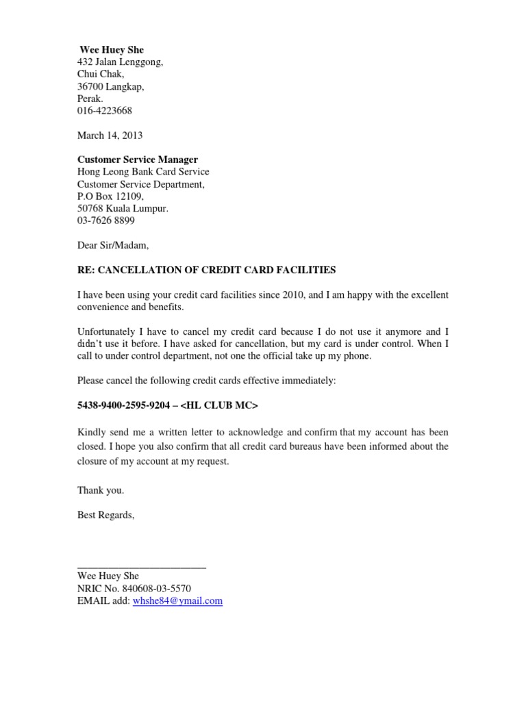 You can close your credit card without writing a letter, but sending a letter gives you physical proof that you requested your account to be if you have any recurring bills being charged to this credit card, make sure you change them to keep them from being declined (and your services cancelled). How to find out the balance of your card, its very simple! If a credit card holder confirms the cancellation of his card via letter, the card is canceled. If none of these actions work, the next step may be to contact an attorney; I dont know how to make a letter. This letter is used to communicate with your credit card company to cancel your credit card account because you are unsatisfied with the new terms of your account. I am writing this letter to inform you that i need to cancel my credit card issued by your bank. If you can't afford to pay call the customer care to block the card, and close the credit card account permanently. There are many good reasons to cancel a credit card. Below is a sample of a letter a customer has to write to a bank manager in order to get his credit card canceled. If you have any remaining balance, mention how and when you would be cancellation letters are letters you write to a service provider, company or institution, informing them that you are dissatisfied with their product. Only a court order could stop. The main card is on my name mr.